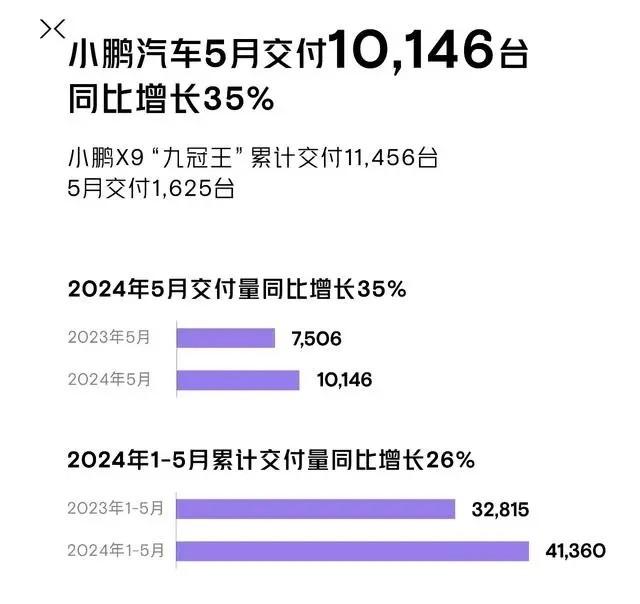 在銷量方面,5月份交付量達到了10146臺,同比增長了35%,環比增長了8%,其中小鵬X9的交付量達到了1625臺,可見其銷量也正逐步回暖,并趨向平穩。仍需要注意的是,當前小鵬旗下在售的產品并不少,但其實也有很長一段時間沒有進行更新迭代,相比當下新品,其產品競爭力確實是有點不足。