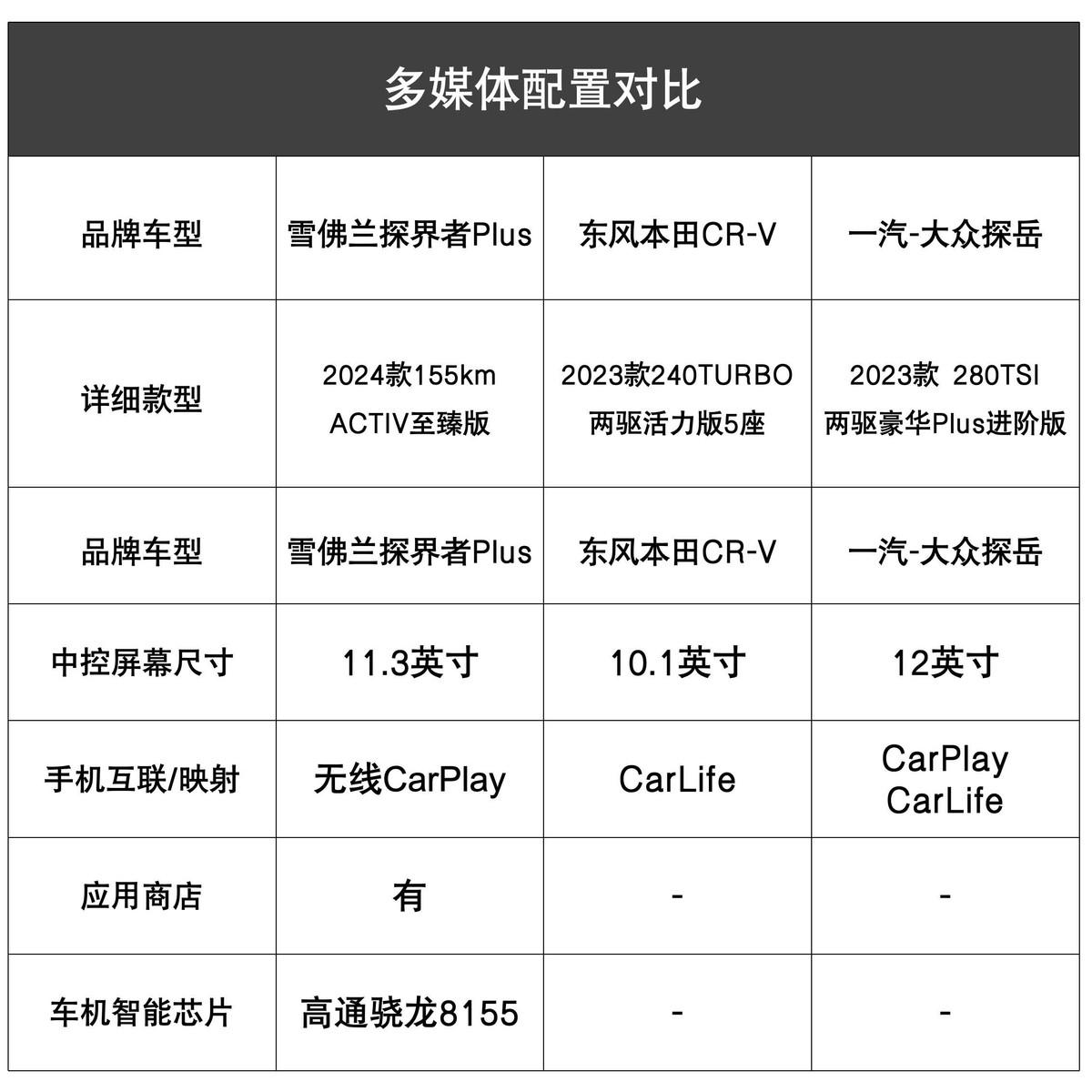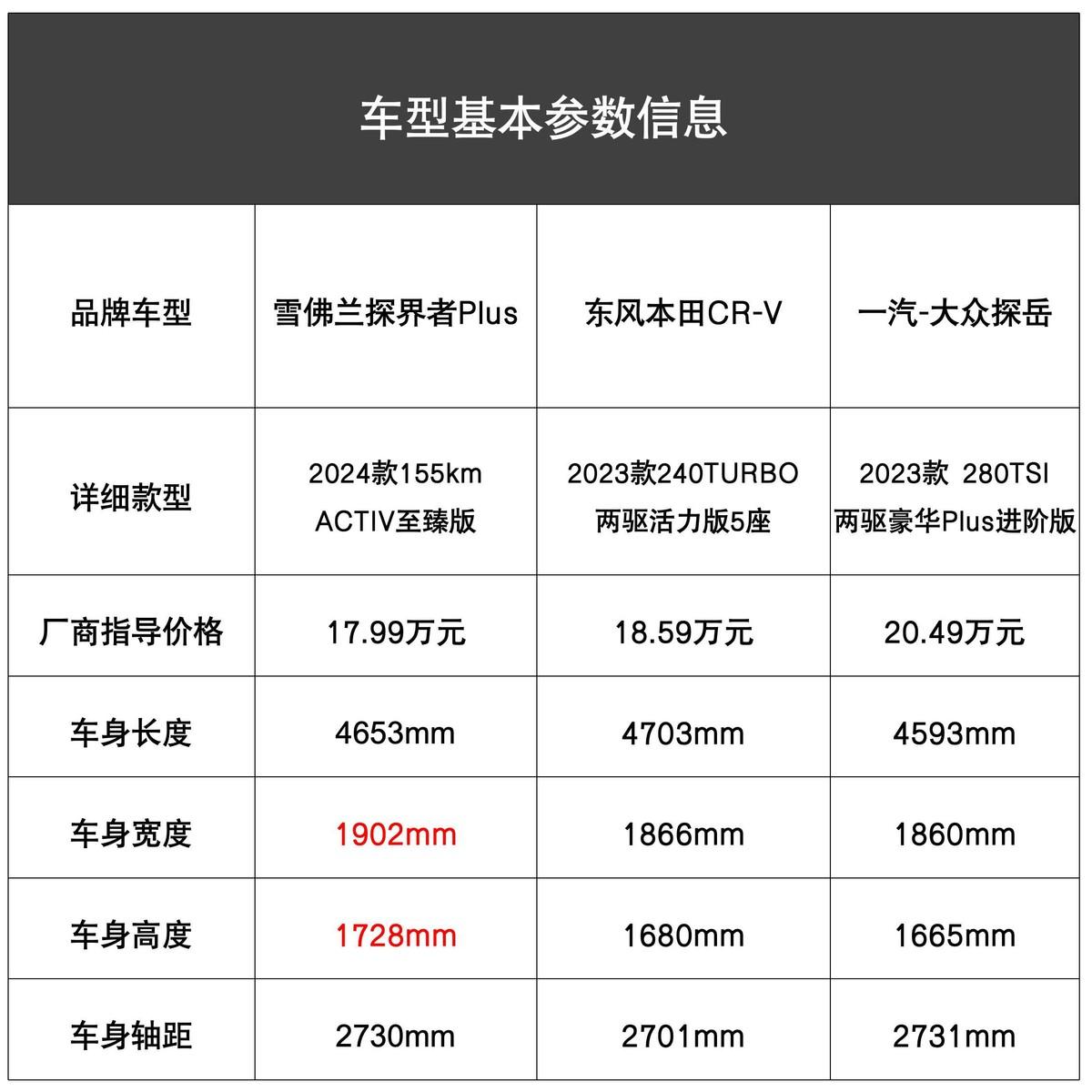畢竟雖然探岳和CR-V都有PHEV的車款可供選擇,但探岳GTE PHEV版本24.29萬元、本田CR-V PHEV版本22.59萬-26.99萬元的售價還是要比探界者Plus 高了不少,理論上在價格維度這三款車并不在對比范疇之列。