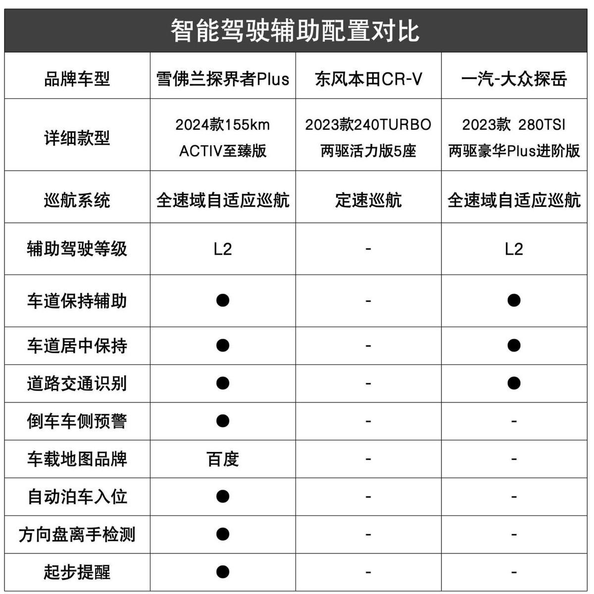 智能駕駛層面,探岳和探界者Plus的功能全面性會比本田CR-V更出色一些,前二者能夠提供全速域自適應巡航,輔助駕駛等級均達到了L2級別,而本田CR-V則僅能支持普通的定速巡航功能。