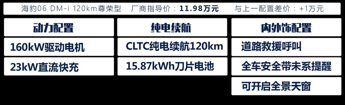 海豹06 DM-i 120km旗艦型是車系的頂配,售價是13.98萬元,相對上一配置車型貴了一萬元,但同時增加了十多項配置,主要以便捷性、舒適性配置為主,很符合那些對配置有較高要求,同時購車資金比較充裕的朋友。在我看來,它的性價比挺高的,但考慮到增加的配置更多是錦上添花,因此它的推薦度會相對低一些。