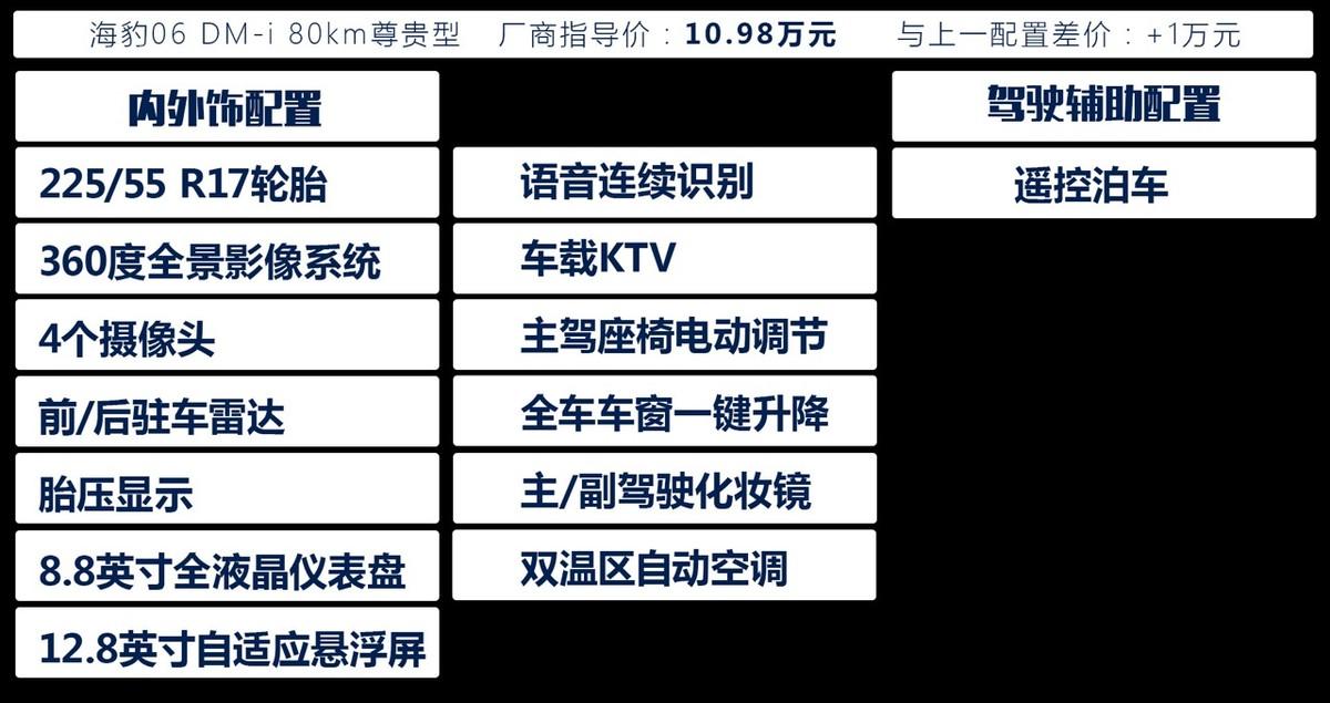 繼續往上選是海豹06 DM-i 80km尊貴型,動力和純電續航跟最低配車型相同,但相對增加了不少實用型配置,同時部分配置也得升級,多花一萬元換來這些提升是物有所值的,用車的幸福感也會有一定的提升,因此我認為它的推薦度會相對最低配要高一些。