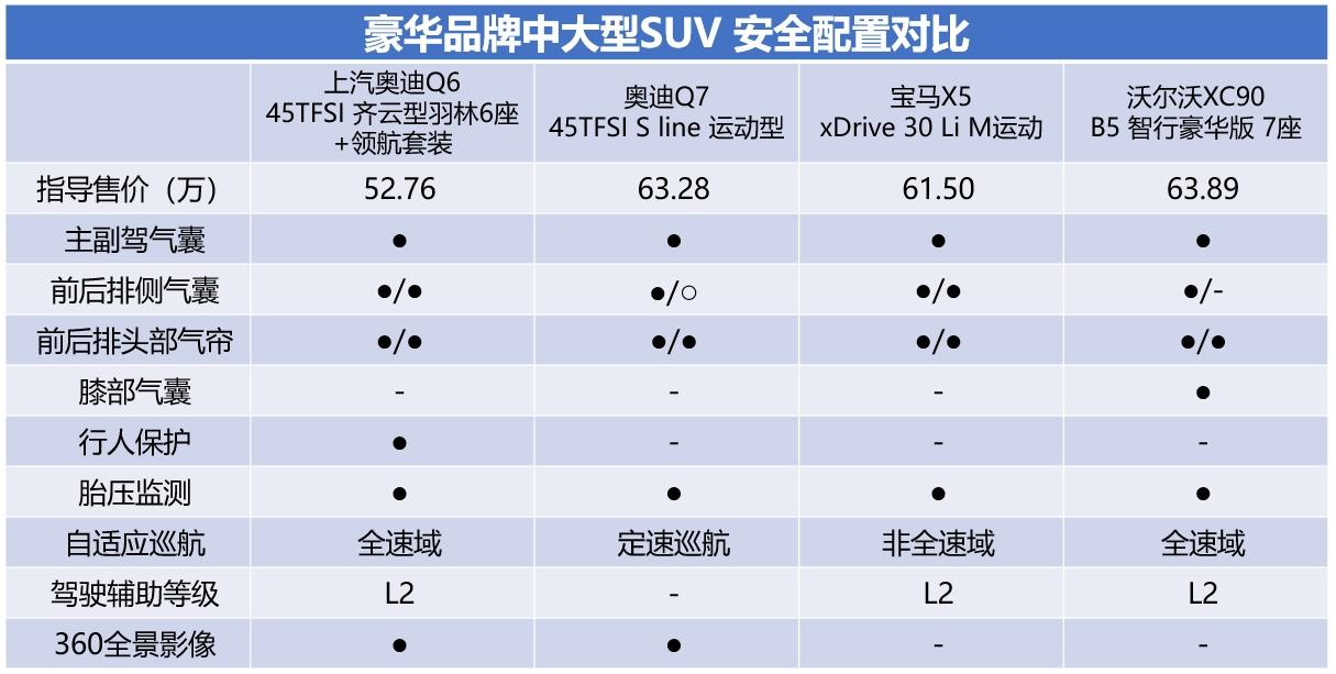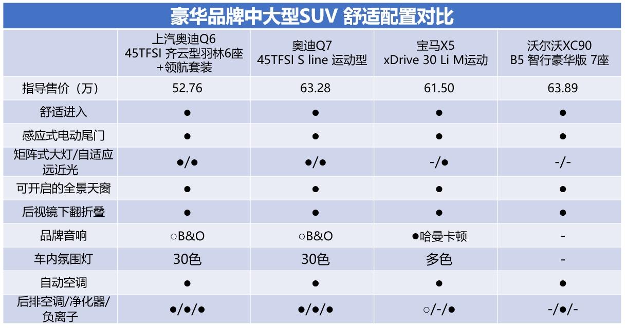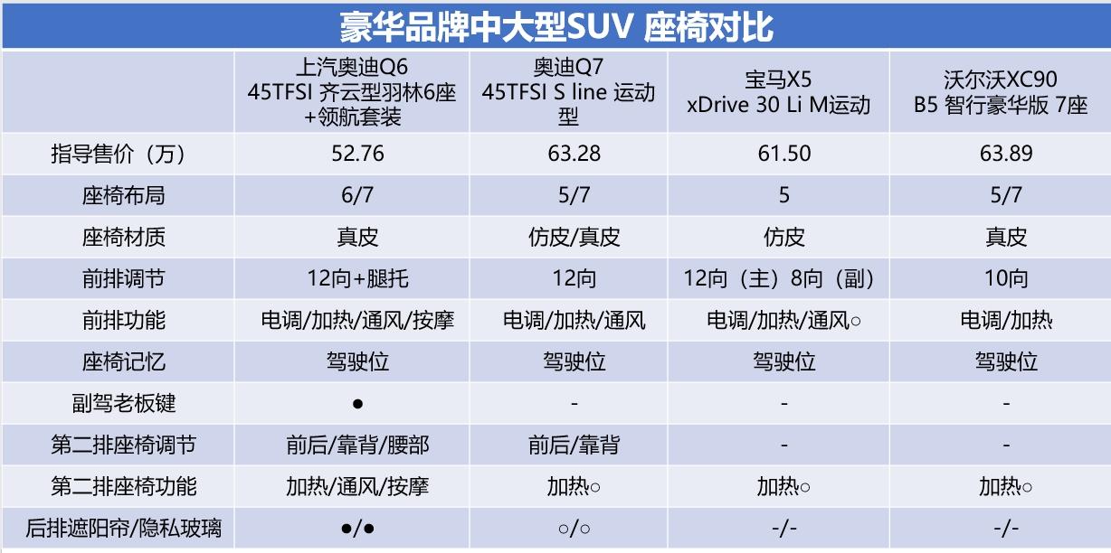 拋開6座的因素,我們通過上表對比四臺車乘坐配置也可以看出,奧迪Q6無論在座椅材質、座椅功能、老板鍵以及后排遮陽簾、隱私玻璃這些方面都比較完備,而其余三款車型都或多或少的有一些缺失,因此如果拋開單純對某品牌愛好這一因素外,奧迪Q6的品價比無疑是最高的。