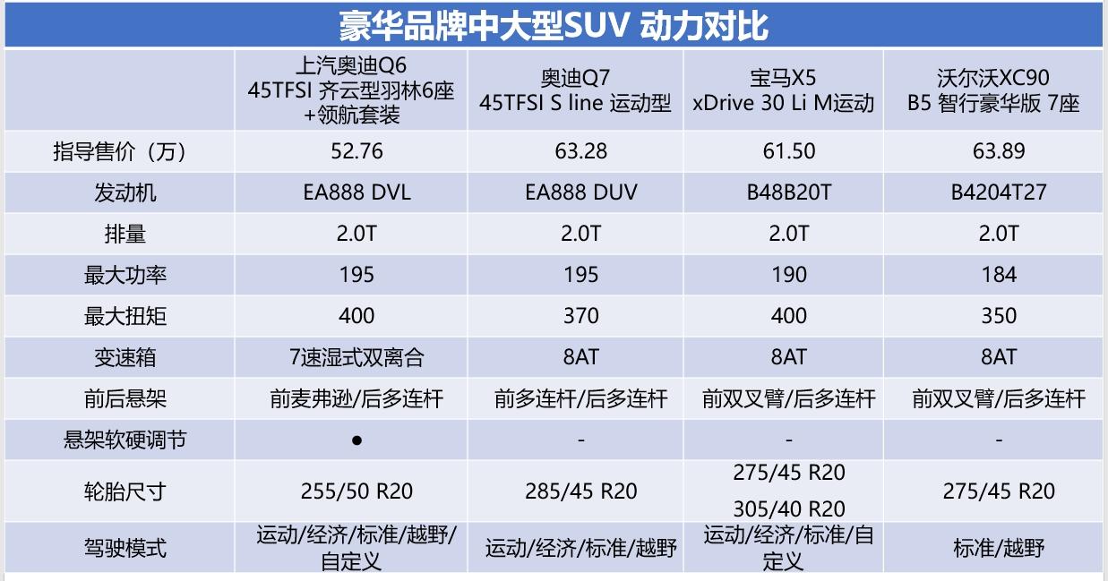 最后是動力系統的,為了節能減排的大趨勢,因此目前市面上的主流中大型SUV都匹配的是2.0T為主流的發動機,而在發動機技術上,BBA品牌都有屬于自己的優勢,如果單論數據的話,奧迪Q6和寶馬X5顯然更具優勢。
