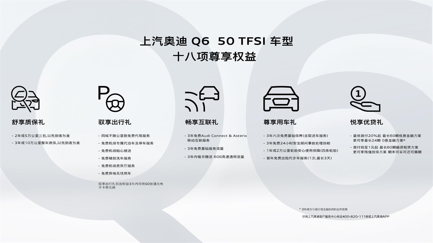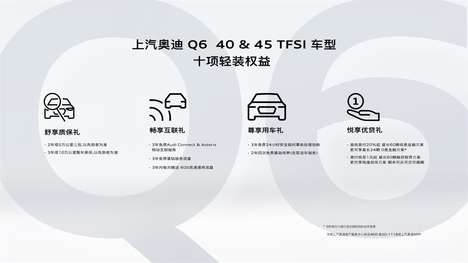 除了價格上的優勢外,上汽奧迪Q6全系車型還為40TFSI和45TFSI車主提供了10項權益;50TFSI車主提供了18項權益,這些權益覆蓋了保養、用車以及出行方面的各種關懷,真正實現了擁車周期的全方面品牌關懷,因此如果正在考慮購入一臺豪華品牌中大型SUV的你,不妨親身體驗一下奧迪家族最新的這款SUV,上汽奧迪Q6吧。