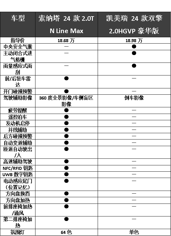 我們拿凱美瑞和索納塔價位兩款車型做對比,通過下方表格信息可以看出,索納塔整體的配置更占優,例如在智駕部分,索納塔實現的功能會更高階更主流,包括自動變道輔助、自動上下匝道等。