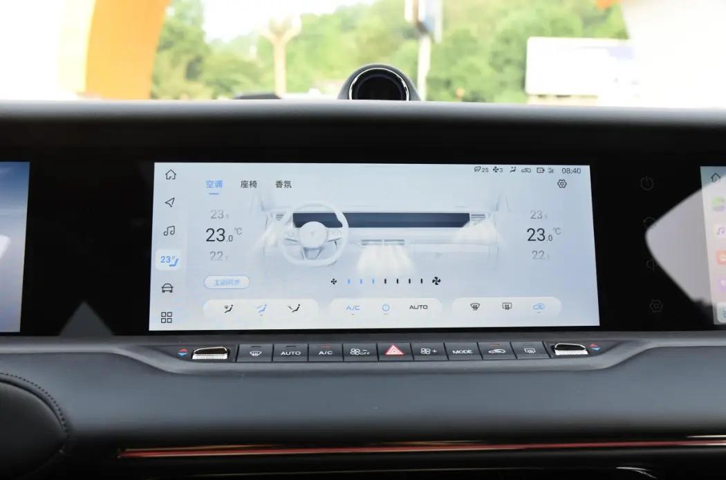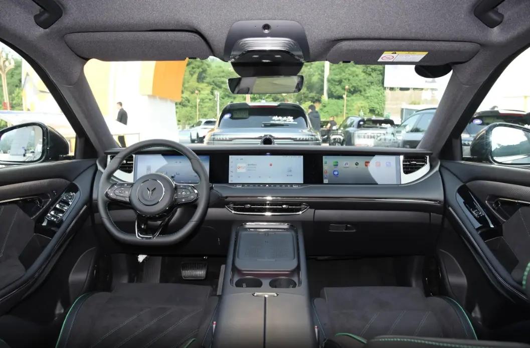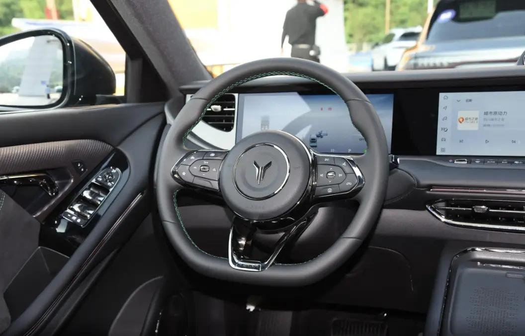 這款車的內飾看起來很干凈清爽,有三塊12.3英寸的屏幕,可以升降,感覺科技感很強。方向盤做工精致,按鍵布局也很好,握著很舒服。車里還有電子式懷擋設計,方便實用,前排還有50w無線充電,我手機支持快充,開車十分鐘手機就充了將近70%的電。車機裝了高通驍龍8155芯片,有128GB存儲空間,運行流暢,支持5G網絡,還有OTA升級、面部識別、聲紋識別、手勢控制等功能。