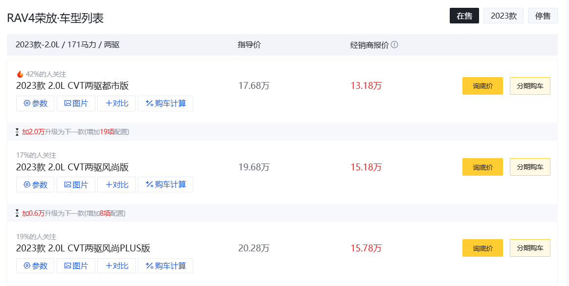 這不,在國內一向是不愁賣的豐田,最近一段時間也玩起了降價,旗下的緊湊型SUV RAV4榮放的入門版車型(2023款 2.0L CVT兩驅都市版)的實際售價已經不足13萬元,而在我們江蘇地區,如果走貸款的話,售價還可以降到12萬元以下。那么,接下來咱們就來聊聊這款車,看一看以當下的行情是否適合抄底了呢?