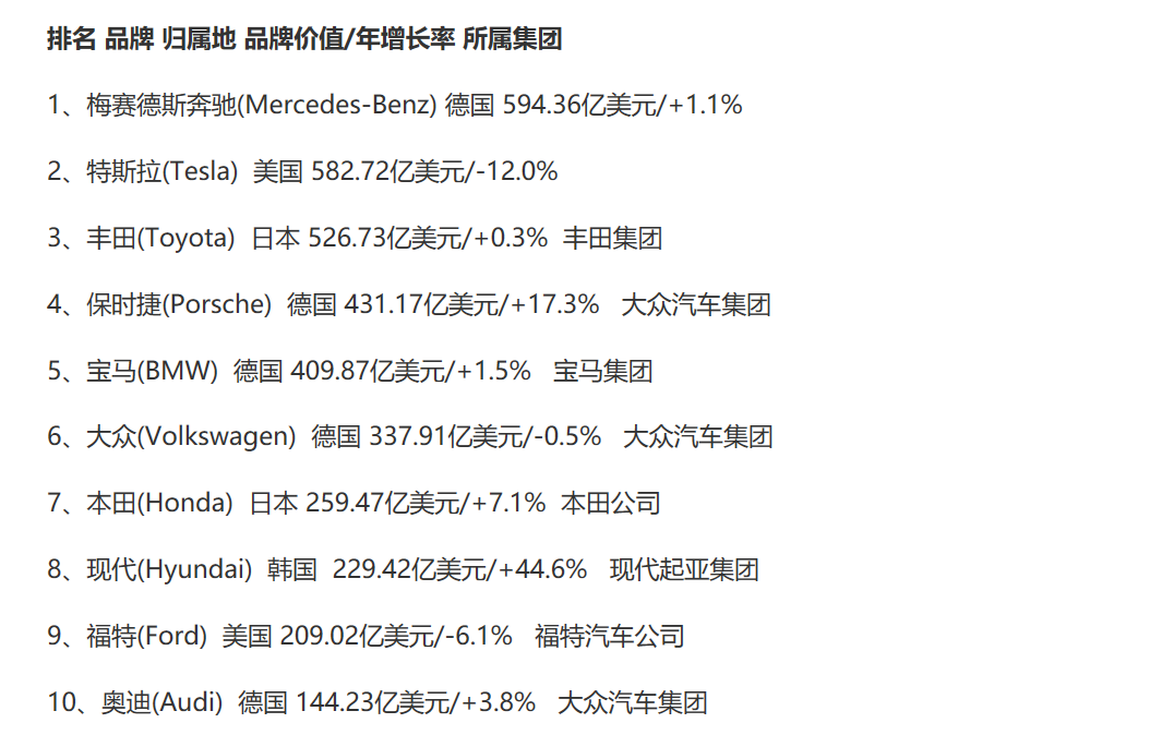 此外,日本本田和韓國現(xiàn)代亦成功躋身前十,品牌價(jià)值分別為259.47億美元、229.42億美元。