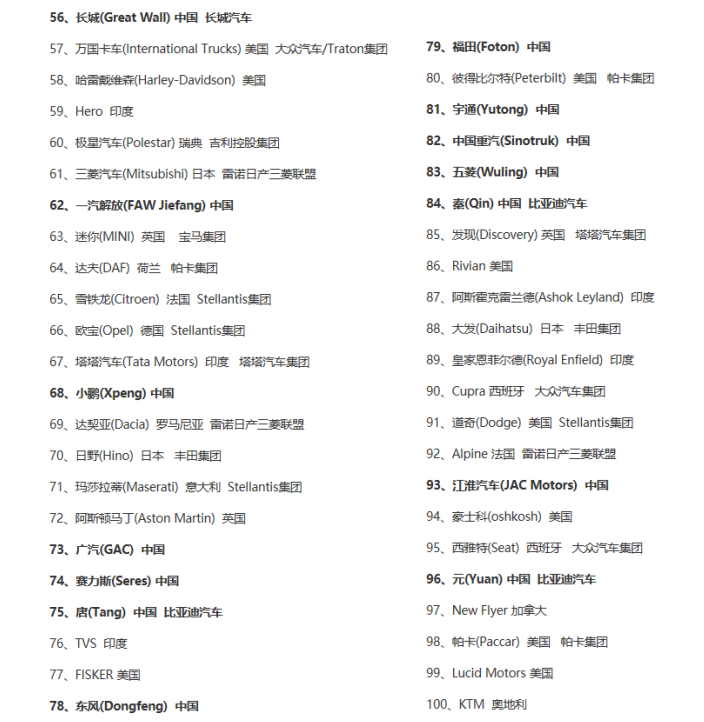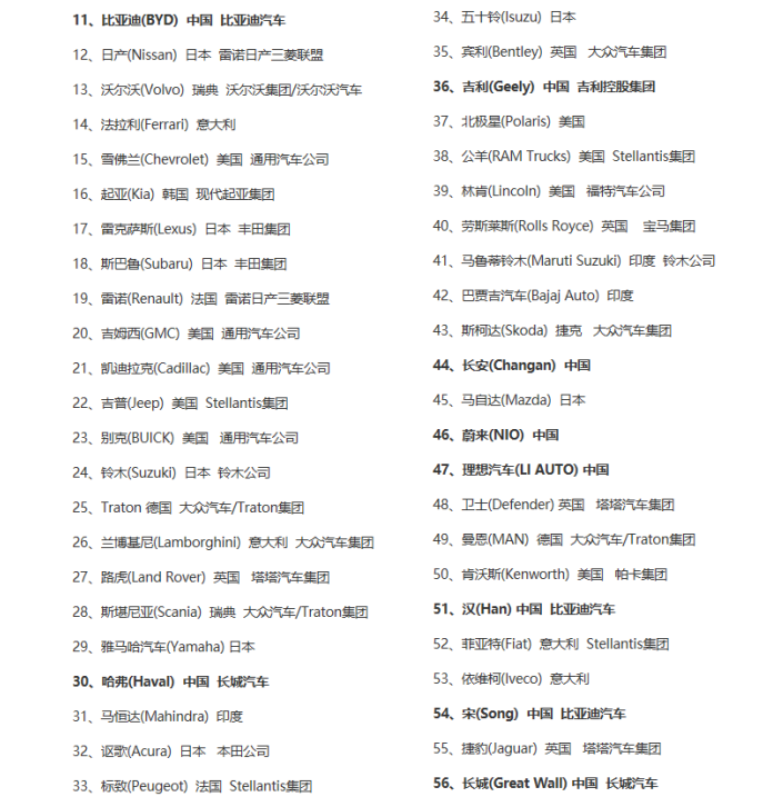 比亞迪排在第11名,長城哈弗和吉利集團(tuán)分別位列第30名、36名,三大老牌車企共同筑建中國汽車品牌在國際領(lǐng)域的地位。