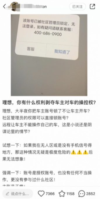 最近,一個理想MEGA車主在網(wǎng)上吐槽:自己的車突然就動不了了!原因是他的車賬號被鎖了。他曬出一張截圖,顯示賬號被社區(qū)管理員給封了,自己怎么登也登不進去。這位車主還特意強調(diào)了一下,自己是全款買車的,平時也沒在網(wǎng)上發(fā)過啥出格的言論。