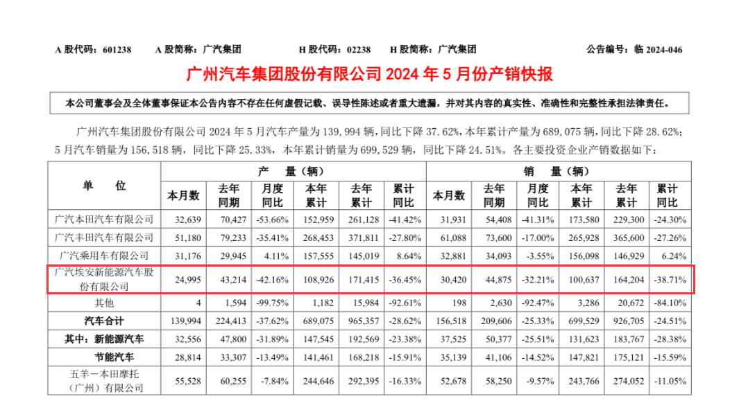 官方數據顯示,2024年1-5月份,廣汽埃安的銷量,相比去年同期,下滑了38.71%,幾乎下滑了四成。
