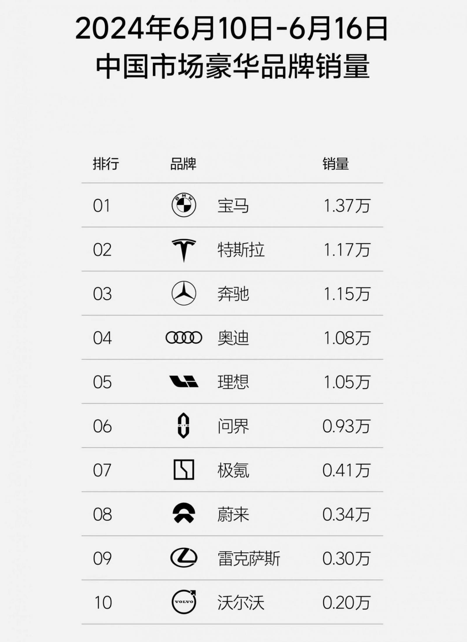 N點評:理想還發布了上一周豪華品牌銷量,這份榜單中,比較意外的是寶馬以1.37萬輛排名第一,比特斯拉還要多(特斯拉也算豪華品牌?)值得注意的是,理想一周和奧迪、奔馳等豪華品牌的銷量相當接近,相信這才是這份榜單的真實用意。