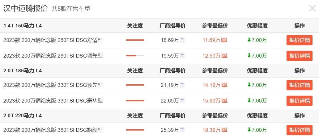 就以指導價18.69萬元的邁騰2023款 200萬輛紀念版 280TSI DSG舒適型為例,在優(yōu)惠了7萬元之后,新車的參考最低價也是直接來到了11.69萬元。那花不到12萬的裸車價格就能夠買到一臺1.4T的邁騰,這買賣難道不劃算嗎?