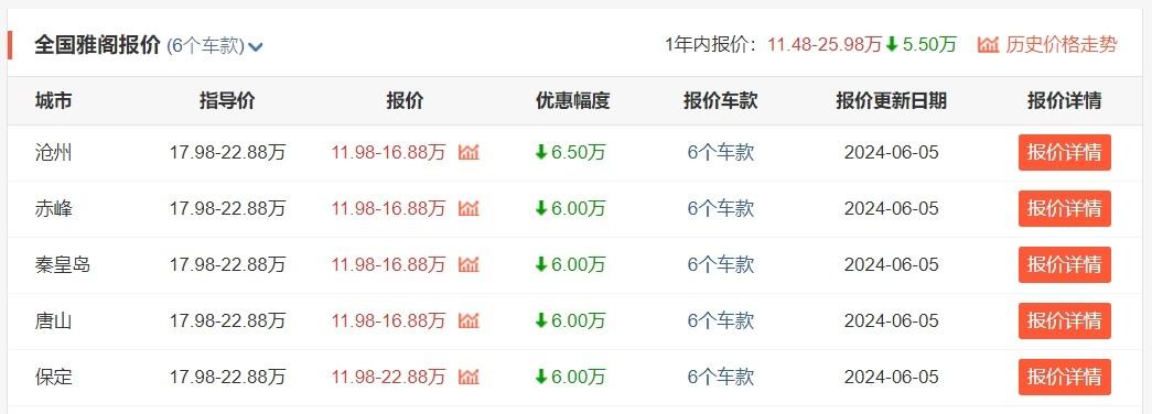 從我們所了解到的信息來看,燃油版雅閣目前在滄州、赤峰、秦皇島等地區(qū)都擁有6萬元以上的優(yōu)惠,其中,滄州地區(qū)的雅閣最低配車型能優(yōu)惠6萬,參考最低價來到了11.98萬元區(qū)間。