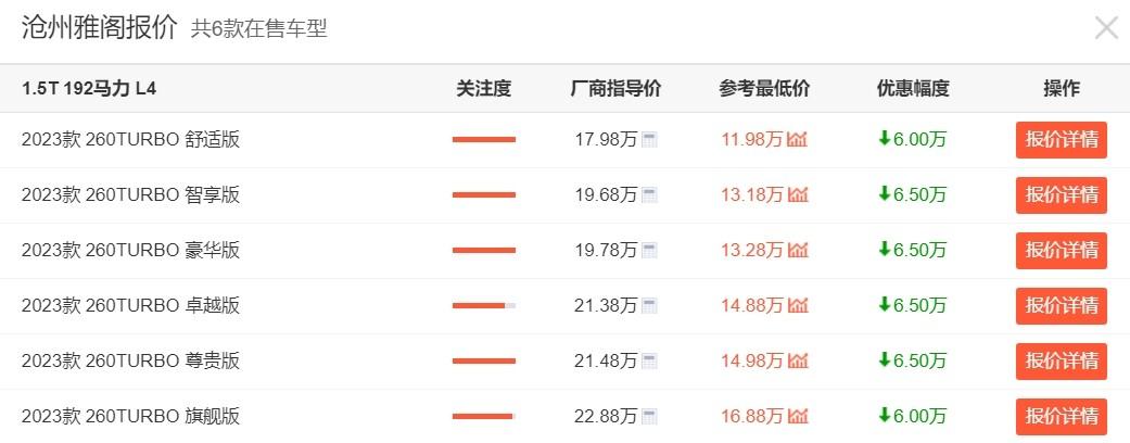 而其余車型則是都能優(yōu)惠6.5萬,也就是說,即使你購買全系最頂配、售價22.88萬元的雅閣2023款 260 TURBO 旗艦版,其優(yōu)惠完之后的價格也來到了16.88萬元,屬實是性價比很高的一款合資B級車了,強烈建議大家不要再錯過。