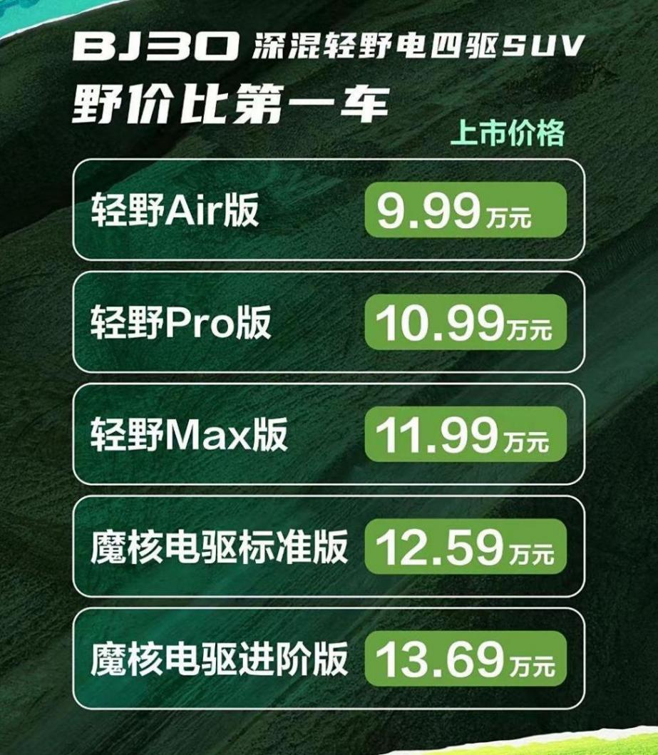 沒想到,在5月22日上市的全新北京BJ30居然定出了一個9.99萬起的價格。要知道,這可是一臺采用了非承載式車身結構的輕越野SUV,即便是最低配車型,其也配備了一臺1.5T渦輪增壓發動機,再加上高配還提供有1.5T混動系統可選,因此整體給人的性價比還是蠻高的。