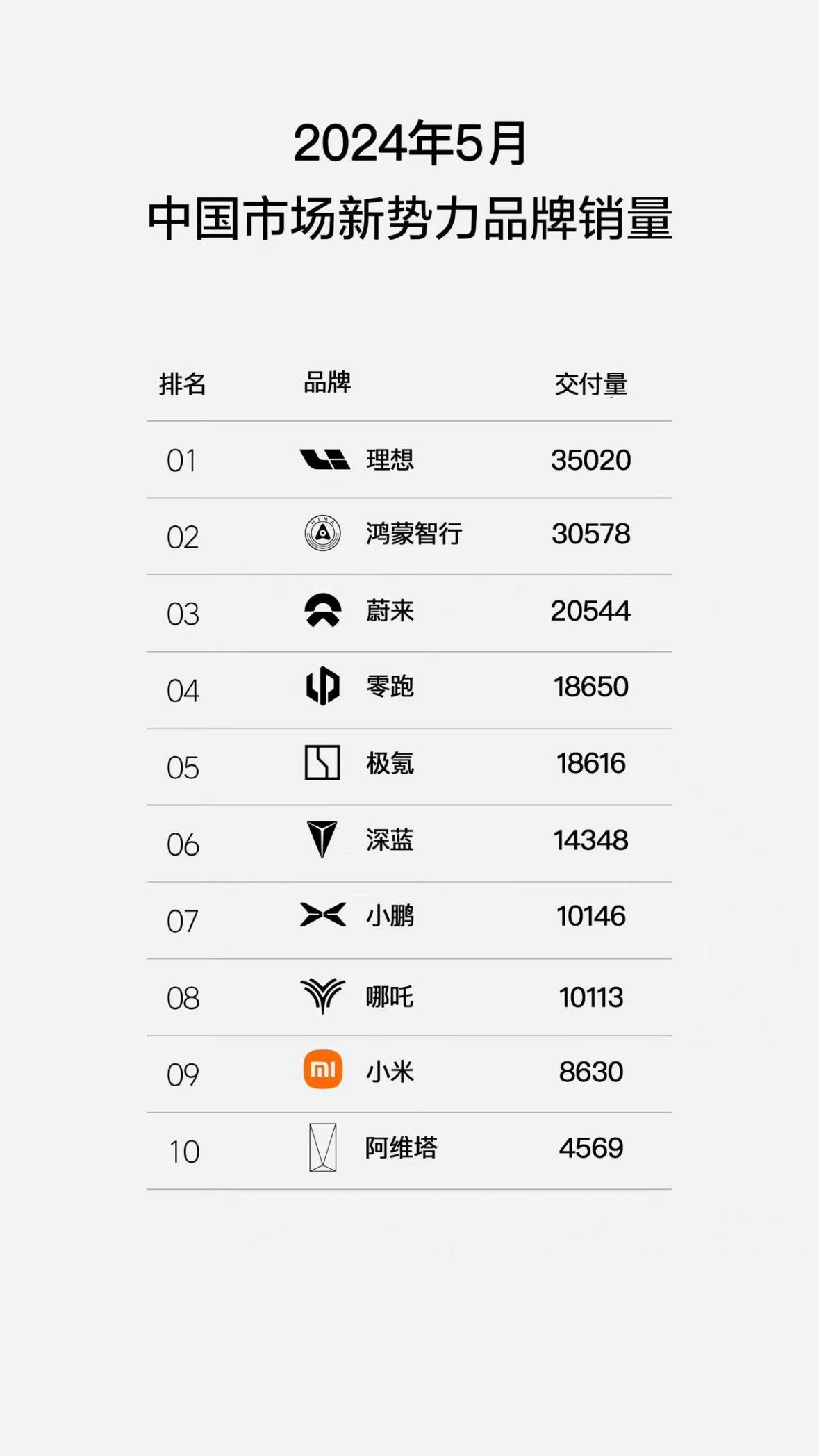 近日,全新2024年5月新勢(shì)力汽車品牌的最新銷量榜單出爐,前十名之中,基本都是大差不差那么幾個(gè)品牌,大概就是上下調(diào)換一下順序。雖然“蔚小理”這個(gè)說(shuō)法已經(jīng)沒(méi)有太大說(shuō)服力了,但我們看慣了白紙黑字的榜單,為何小米汽車獨(dú)獨(dú)是彩色?