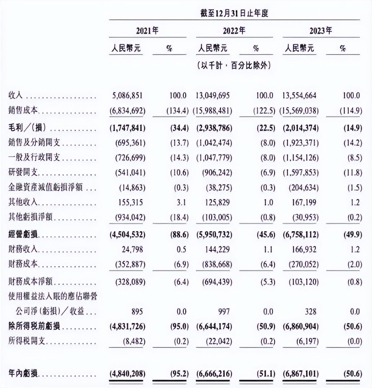 但從近日合眾新能源的招股書來看,哪吒汽車近幾年的財務狀況并沒有很理想,反而處于持續虧損的狀態。數據顯示,合眾汽車2021年到2023年,虧損數額逐漸遞增,分別是48.40億元、66.66億元、68.67億元。體現在毛利率方面,便是哪吒汽車的毛利率到2023年仍處于負數狀態,為-14.9%。