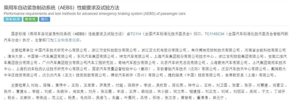 目光再回到國(guó)內(nèi)。國(guó)家標(biāo)準(zhǔn)GB/T 39901-2021《乘用車自動(dòng)緊急制動(dòng)系統(tǒng)(AEBS)性能要求及試驗(yàn)方法》對(duì)車輛的AEB功能提出了要求。而起草這份標(biāo)準(zhǔn)的單位涉及汽車科研機(jī)構(gòu)、車企、供應(yīng)商等。其中涵蓋了一汽、上汽、廣汽、北汽等主流車企,并且還出現(xiàn)了新勢(shì)力品牌蔚來(lái)。