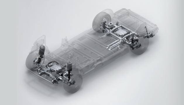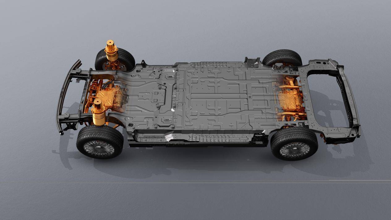 在車輛后部,為了同樣做到純平地板,SOA架構(gòu)將后懸縱梁上置改為下置,并將后懸架彈簧托盤最大化靠近輪邊,使后懸架杠桿比達(dá)到0.675,較同級平均高出25%。這使得不僅車內(nèi)空間更大,還能讓該架構(gòu)可兼容空懸、CDC與后置電機(jī)等配置,確保車輛的豪華、舒適屬性。