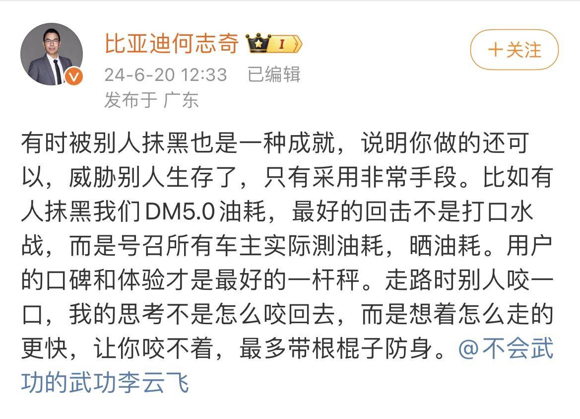 榮威發(fā)布海報約一個小時后,比亞迪股份有限公司執(zhí)行副總裁何志奇發(fā)布一條微博,大意是,有人抹黑(比亞迪)說明自己“做的還可以”,自己走路被咬一口,不會咬回去,最多帶跟棍子防身。他同時@了比亞迪集團品牌及公關(guān)處總經(jīng)理李云飛。