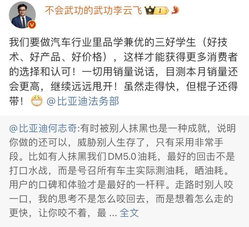 李云飛轉(zhuǎn)發(fā)了上述微博并配文,大致意思是,比亞迪要做“三好學(xué)生”,一切用銷量說話,本月銷量將“繼續(xù)遠(yuǎn)遠(yuǎn)甩開”,他也提到了“棍子還得帶”。