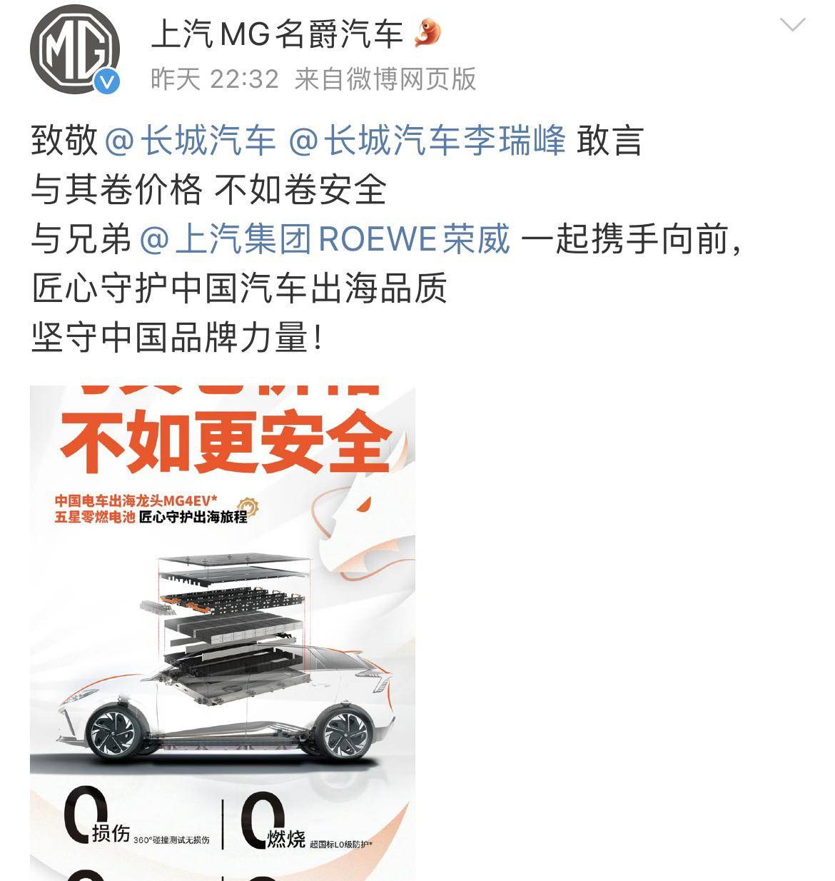 6月20日22點32分,上汽名爵發(fā)動態(tài)力挺長城汽車?yán)钊鸱澹约白约倚值軜s威,配文“與其卷價格,不如卷安全”。