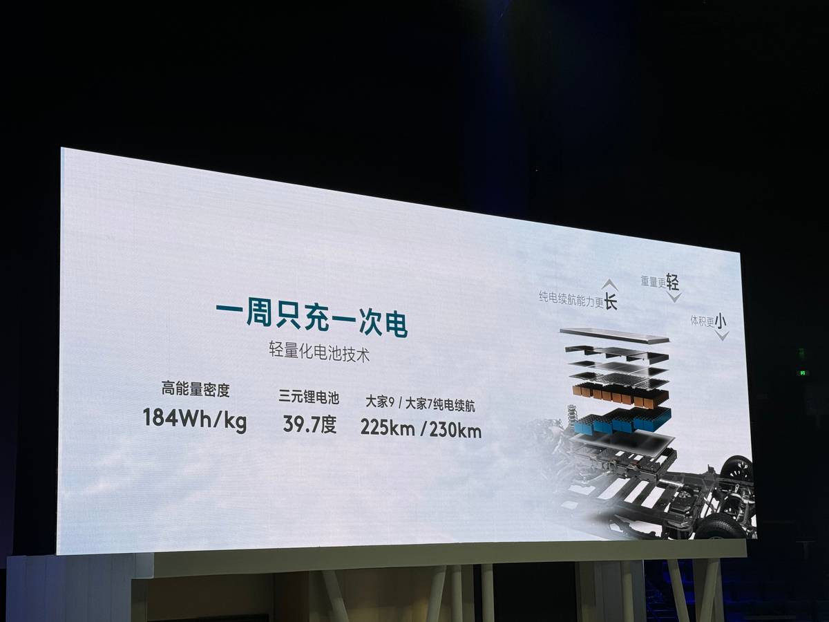 這背后則得益于P1/P3雙電機結構,在176kW/390N·m的峰值功率和扭矩下,可以實現0-80km/h純電速域。而且大電池版本車型電池能量密度≥184Wh/kg,加上39.7kWh的電池容量,可以讓大家7實現230km的純電續航,大家9實現225km的純電續航,對于大多數通勤人來說一周只充一次電即可。