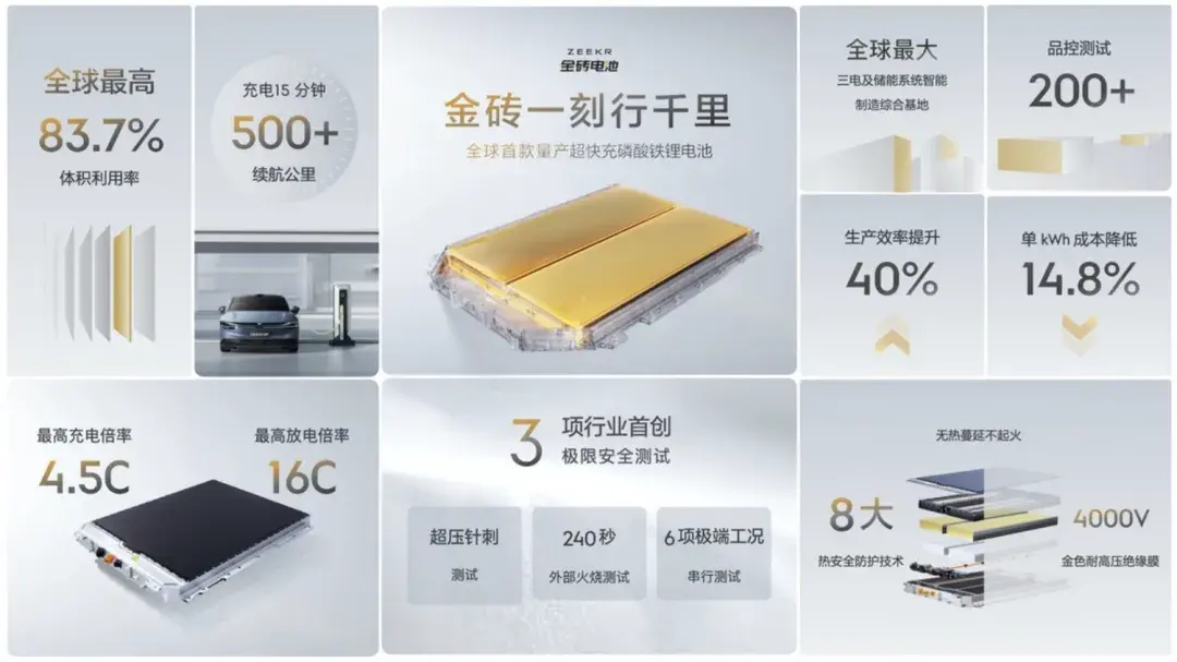 這個標準就是極氪自研的金磚電池,它的電芯結構和比亞迪的刀片電池類似,但性能更強,不僅支持800V平臺,還具備4.5C的充電倍率,最快15分鐘就能充500公里