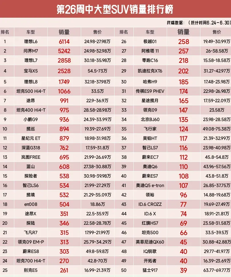 然而相對寶馬X5對比,其它車銷量不那么如意,其中第7名:途昂,銷量991輛,其售價區間在22.9-36.9萬之間。第13名:嵐圖FREE,銷量695輛,其售價區間在21.99-26.69萬之間。第18名:eπ008,銷量504輛,其售價區間在18.86萬之間。第22名:領克09 EM-P,銷量313輛,其售價區間在25.79-34.29萬之間。第37名:智己LS7,銷量116輛,其售價區間在23.98-40.98萬之間。