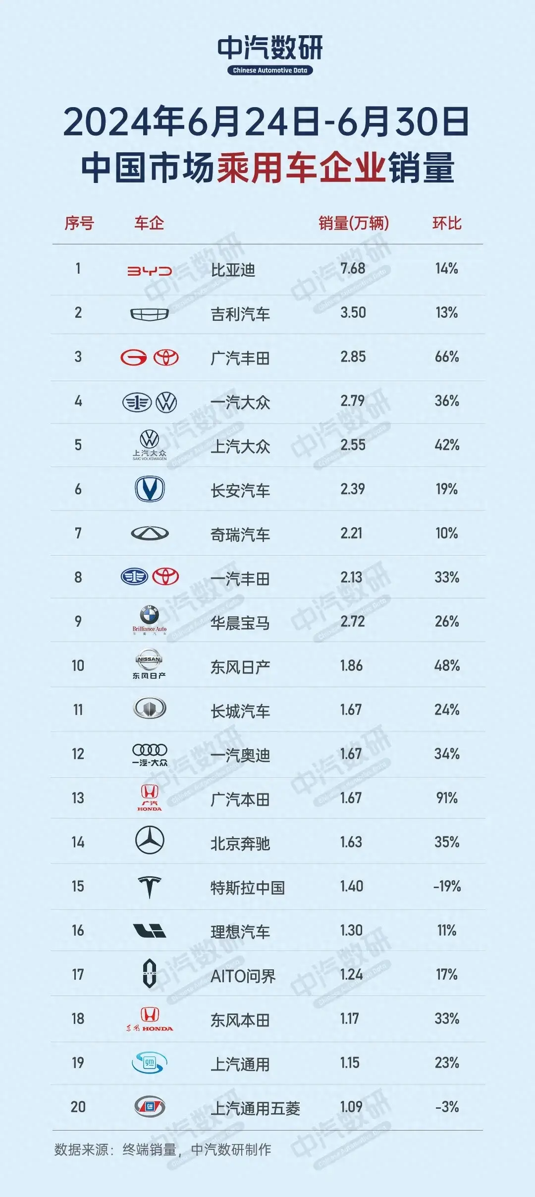 長城汽車、CIID一涅大眾一汽奧迪、廣汽本田、北京奔馳、特斯拉中國、理想汽車、8AITO問界、HONDA東風本田、上汽通用和上汽通用五菱等車企競爭激烈,銷量也是相差較大。長城汽車:銷量1.67萬輛,環比增長24%位列11。一汽大眾/一汽奧迪(合并數據):銷量1.67萬輛,環比增長34%排名第12。第13.:廣汽本田:銷量1.67萬輛,環比增長91%,第14. 北京奔馳:銷量1.63萬輛,環比增長35%。第15. 特斯拉中國:銷量1.40萬輛,環比增長-19%。第16. 理想汽車:銷量1.30萬輛,環比增長11%。第17. AITO問界(可能是指“賽力斯”品牌):銷量1.24萬輛,環比增長17%。第18. HONDA東風本田:銷量1.17萬輛,環比增長33%第19. 上汽通用:銷量1.15萬輛,環比增長23%。第20. 上汽通用五菱:銷量1.09萬輛,環比增長-3%。