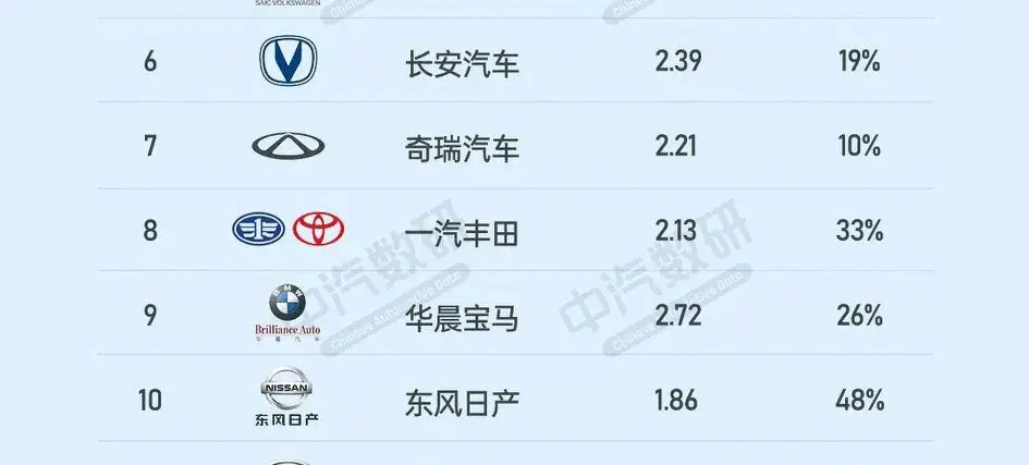 在銷量排行榜的6至10名中,長安汽車、奇瑞汽車、一汽豐田、華晨寶馬和東風日產等車企表現出色。長安汽車以2.39萬輛的銷量位列第六,環比增長19%。奇瑞汽車和一汽豐田分別以2.21萬輛和2.13萬輛的銷量緊隨其后,環比增長均超過10%。華晨寶馬和東風日產分別以2.72萬輛和1.86萬輛的銷量位列第九和第十位,環比增長分別為26%和48%。