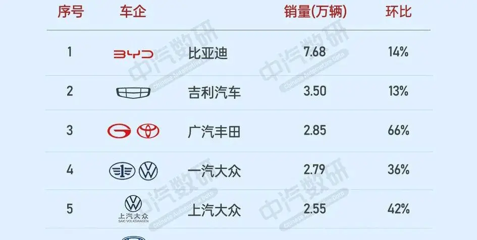 前五名車企表現搶眼。比亞迪以7.68萬輛的銷量穩居榜首,環比增長14%。吉利汽車緊隨其后,銷量達到3.5萬輛,環比增長13%,表現不俗。廣汽豐田、一汽大眾和上汽大眾分列三至五位,銷量分別為2.85萬輛、2.79萬輛和2.55萬輛,環比增長均超過30%。這五家車企憑借各自的品牌優勢、產品實力和市場策略,都獲得了非常不錯的銷量。