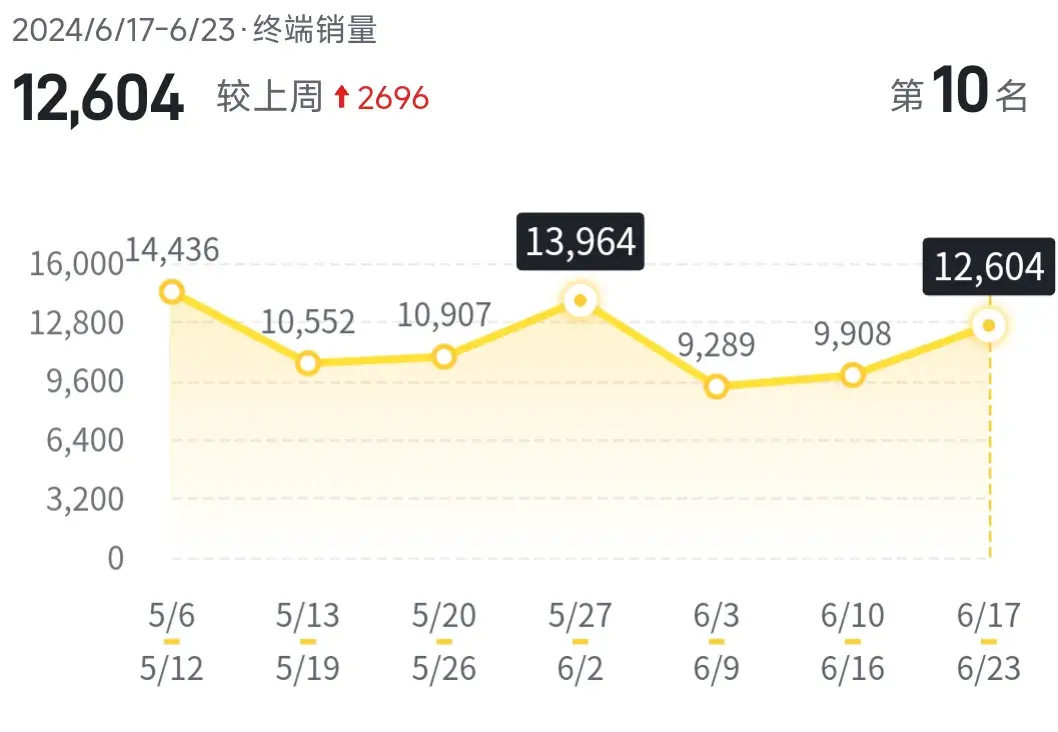 最新6月第四周品牌銷量排行榜中,以其本周銷量12604輛不錯銷量成績,排名品牌榜第10。