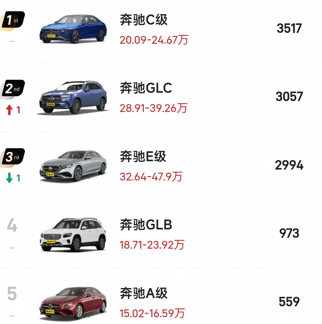 而奔馳各車系表現也不錯,其中奔奔馳C級銷量3517輛,排在第1、奔馳GLC銷量3057輛,排在第2、奔馳E級銷量2994輛,排在第3、奔馳GLB銷量973輛,排在第4。