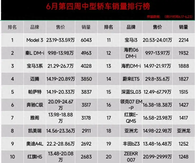 中型車市場火熱,其大空間及性能優(yōu)越深受歡迎,6月第四周中型轎車銷量排行榜出爐,Model 3銷量達(dá)6043奪得冠軍,秦L DM-i、寶馬3系、緊隨其后位列前三,奔馳C級、凱美瑞、奧迪A4L、紅旗H5、入圍前十名。寶馬i3、海豹DM-i、領(lǐng)克07 EM-P、均無緣前十之列。數(shù)據(jù)如下:官宣:6月第四周中型轎車銷量榜:奔馳C級跌出前三