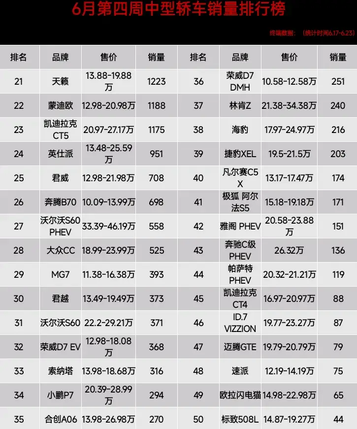 而本周前20-50名銷量較為慘淡,海豹銷量216輛,排在第38、雅閣 PHEV銷量151輛,排在第42、凱迪拉克CT4銷量88輛,排在第45名。