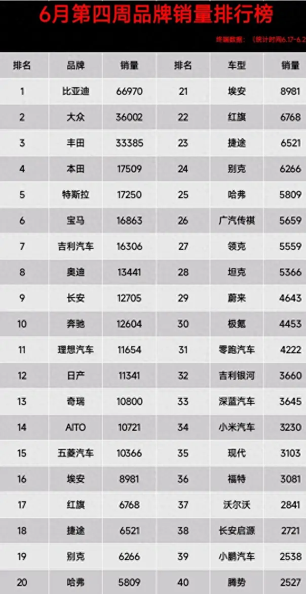 最新6月第四周銷量排行榜已更新,其中比亞迪依舊強勢銷量66970輛再度奪得第一,大眾銷量36002輛,緊隨其后排在第2、豐田銷量33385輛,排在第3。官宣:6月第四周各品牌銷量排行榜,比亞迪第1名、理想跌出前十。
