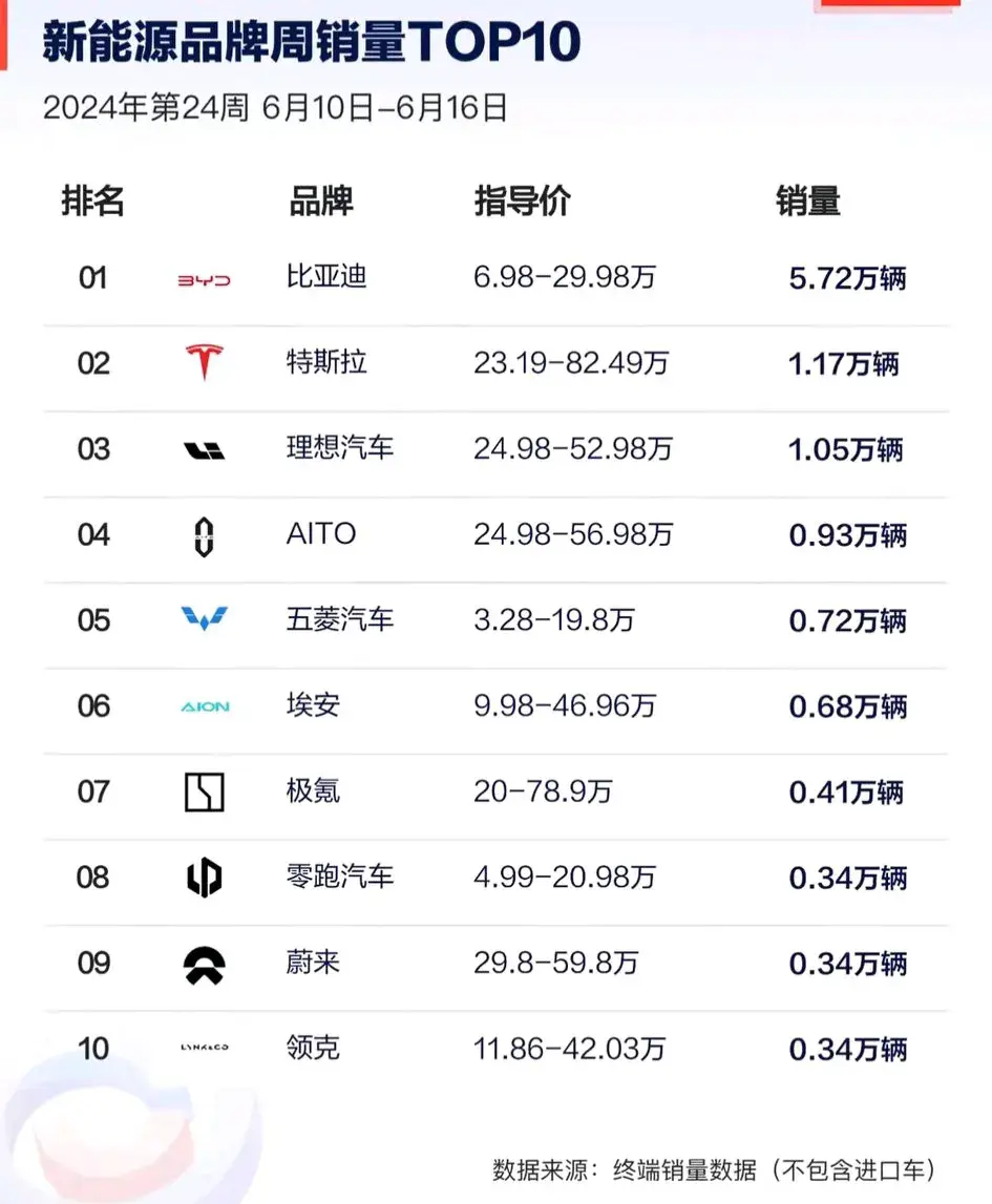 本次周銷量排行榜涵蓋了十個新能源品牌,這些品牌以其獨特的產(chǎn)品和市場策略,在市場中占據(jù)了一席之地。其中,比亞迪以5.72萬輛的銷量位居榜首奪得第一。特斯拉本周銷量達到了1.17萬輛,排名第二。可見特斯拉魅力還是非常大,任然吸引了大量消費者的關(guān)注和喜愛。第三的理想汽車則以1.05萬輛的銷量緊隨其后,作為國內(nèi)新能源汽車市場的后起之秀,理想汽車憑借優(yōu)質(zhì)的產(chǎn)品和服務(wù),在市場中樹立了自己的地位。