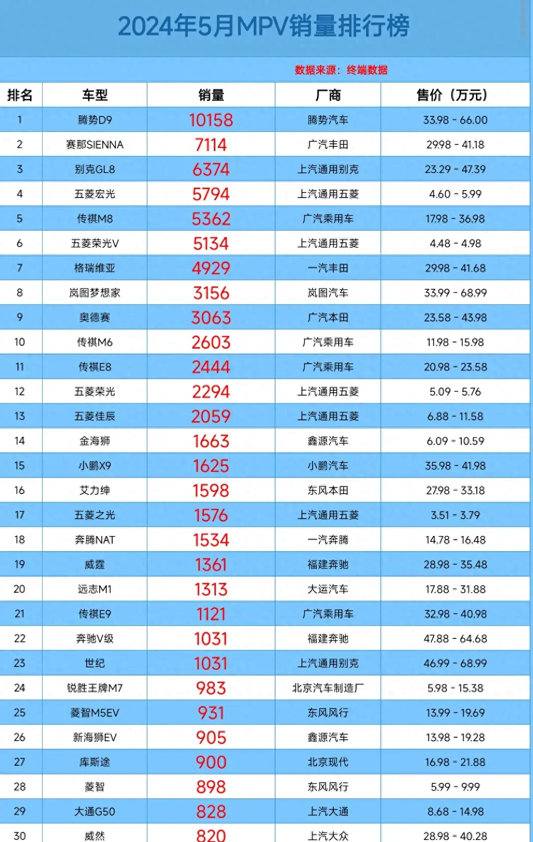 5月MPV銷量排行榜 :騰勢D9銷量1.01萬輛、別克GL8為6374輛