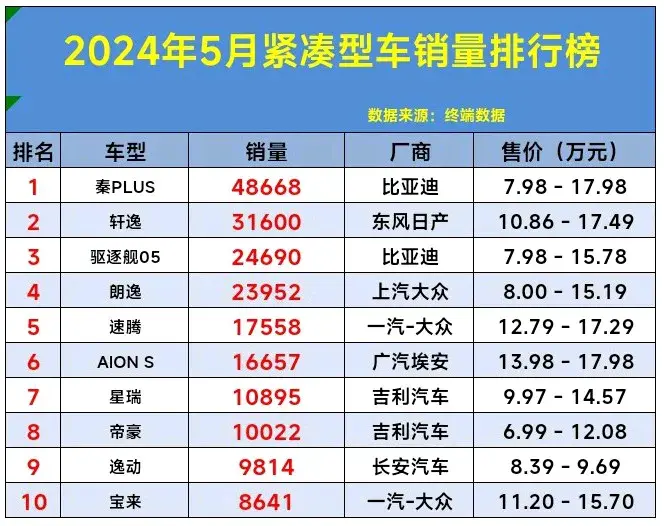 乘聯(lián)會發(fā)布了2024年5月緊湊型車銷量排行榜 。而其中秦PLUS、軒逸、驅(qū)逐艦05、表現(xiàn)最佳,分別獲得前三名,銷量均突破24690輛、而速騰、第5、帝豪、第8、大眾ID.3第16、凌渡第21。