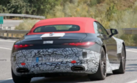從我們獲得的諜照來看,新車在車頭、側(cè)裙、車尾等部分進(jìn)行了偽裝。我們可以發(fā)現(xiàn),新車并沒有采用AMG經(jīng)典的前中網(wǎng)設(shè)計(jì),而是采用了邁巴赫風(fēng)格的直瀑式前格柵,前包圍也使用了貫穿式的通風(fēng)散熱口,整體造型看起來更加優(yōu)雅。從車身側(cè)面來看,新車依然保持了SL經(jīng)典的敞篷車造型,并使用了軟頂敞篷機(jī)構(gòu),預(yù)計(jì)新車的側(cè)裙位置造型將會重新設(shè)計(jì),并使用鍍鉻裝飾。此外,新車輪圈依然是密條輻造型,配備了單鎖輪轂蓋裝飾,并配有對向六活塞制動卡鉗。