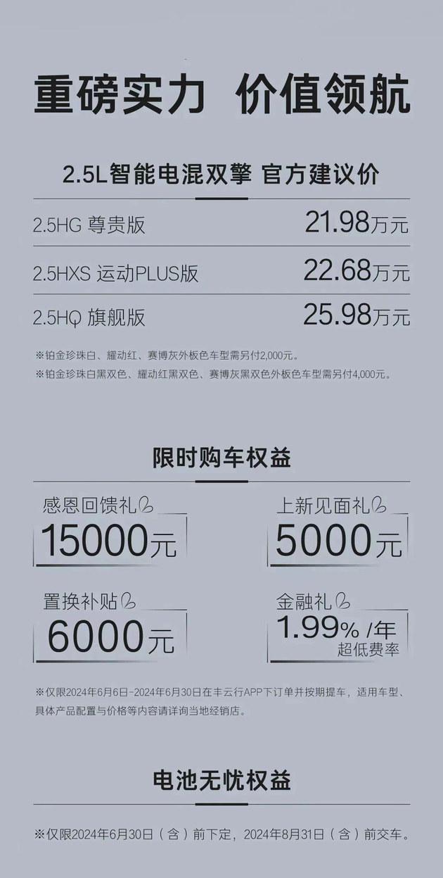6月6日,廣汽豐田第九代凱美瑞(搭載2.5L混動系統的車型)正式上市,共推出3款配置,售價區間為21.98-25.98萬元。