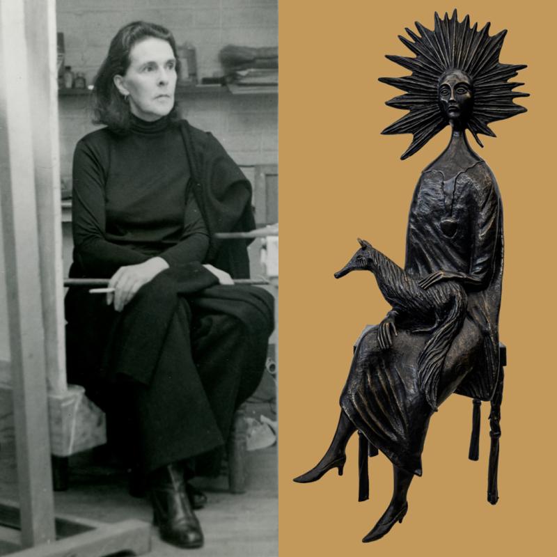 左:Kati Horna,卡林頓在工作室肖像,1956年;右:卡林頓,《抱狐貍的女人》,2010年
