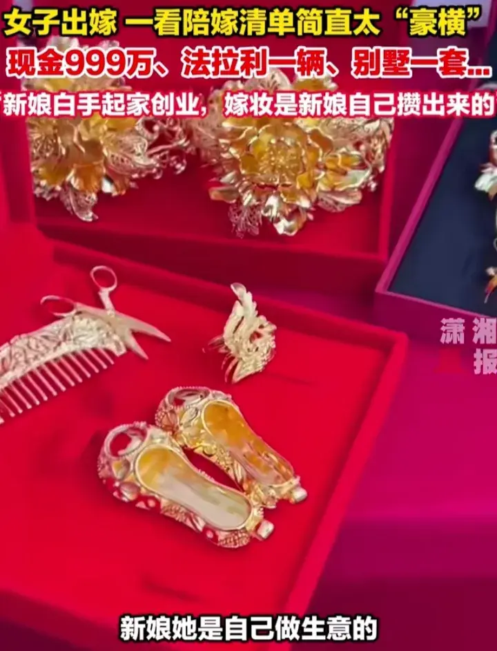 根據(jù)視頻顯示,陪嫁有深圳樓房一套、別墅一套、法拉利一輛、現(xiàn)金999萬;其余金銀首飾更不用說。