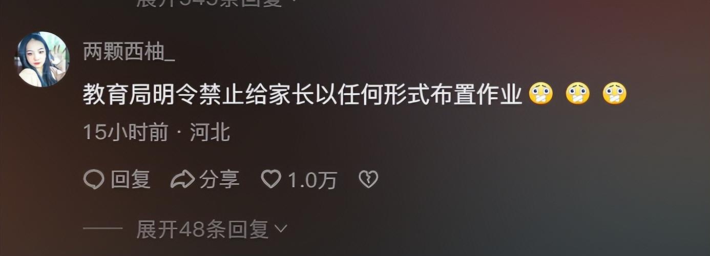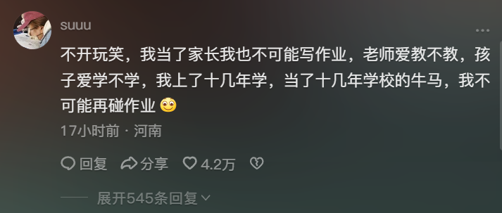 除此之外,有些暴躁網友就忍不了了,直接表達自己當了家長也不可能寫作業,老師愛教不教是你的事,孩子愛學不學我讓他擺爛!不愿意再給學校當牛馬