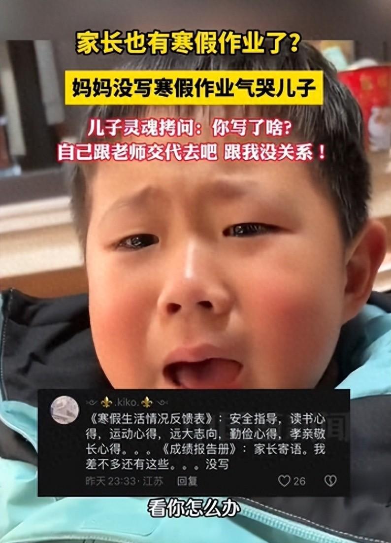 近日,一則短視頻引起大家廣泛討論:媽媽沒寫寒假作業氣哭兒子,兒子靈魂拷問:你寫了啥?自己跟老師交代去吧!