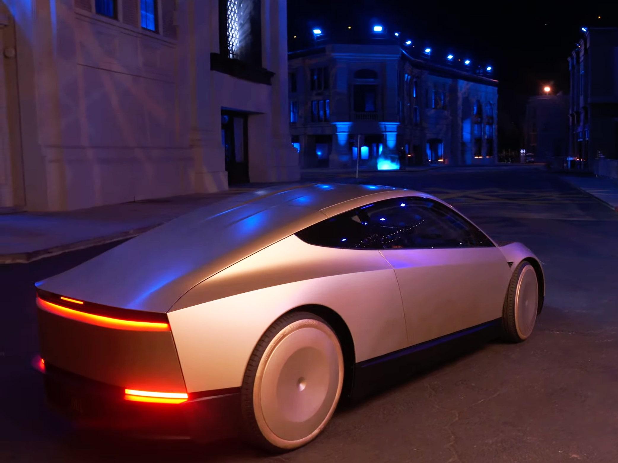 車身表面采用類似賽博皮卡相似的鋁合金蒙皮材質。后車窗是封閉式的,車輪同樣采用封閉式造型。