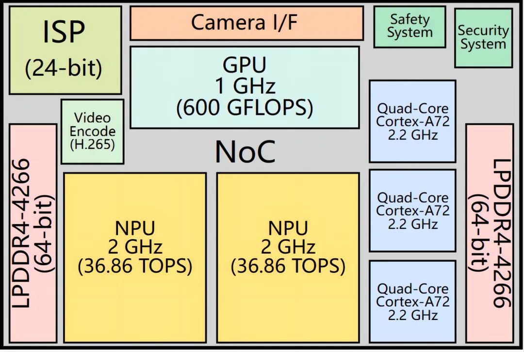 這類大算力芯片一般會包含CPU、GPU、NPU、DSP、ISP、安全MCU、視頻輸入輸出、計算機視覺引擎、各類通信接口。