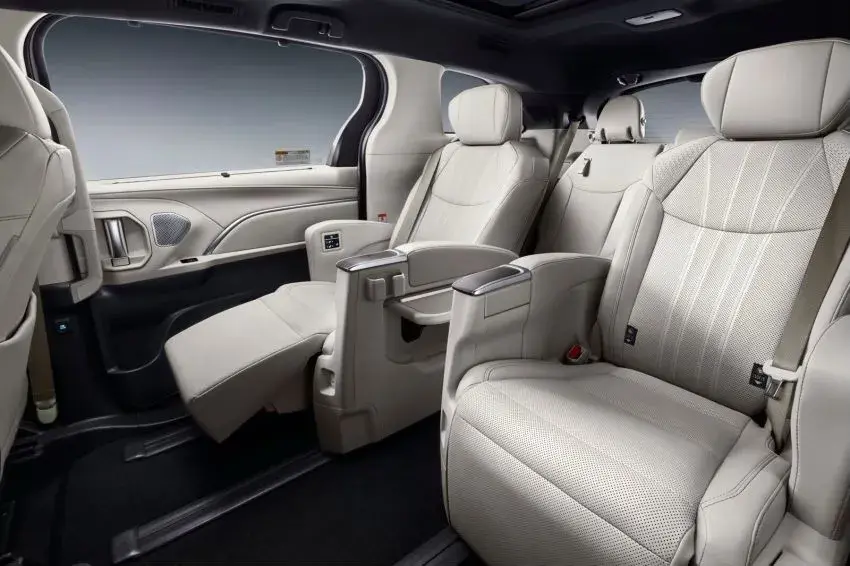 注意布局采取的是2+2+3的方式,所以第二排才是王者座位也就是老板位。他有一個航空座椅功能,可以把腳踏板升起來之后跟飛機的商務艙一樣,躺著非常的舒服。